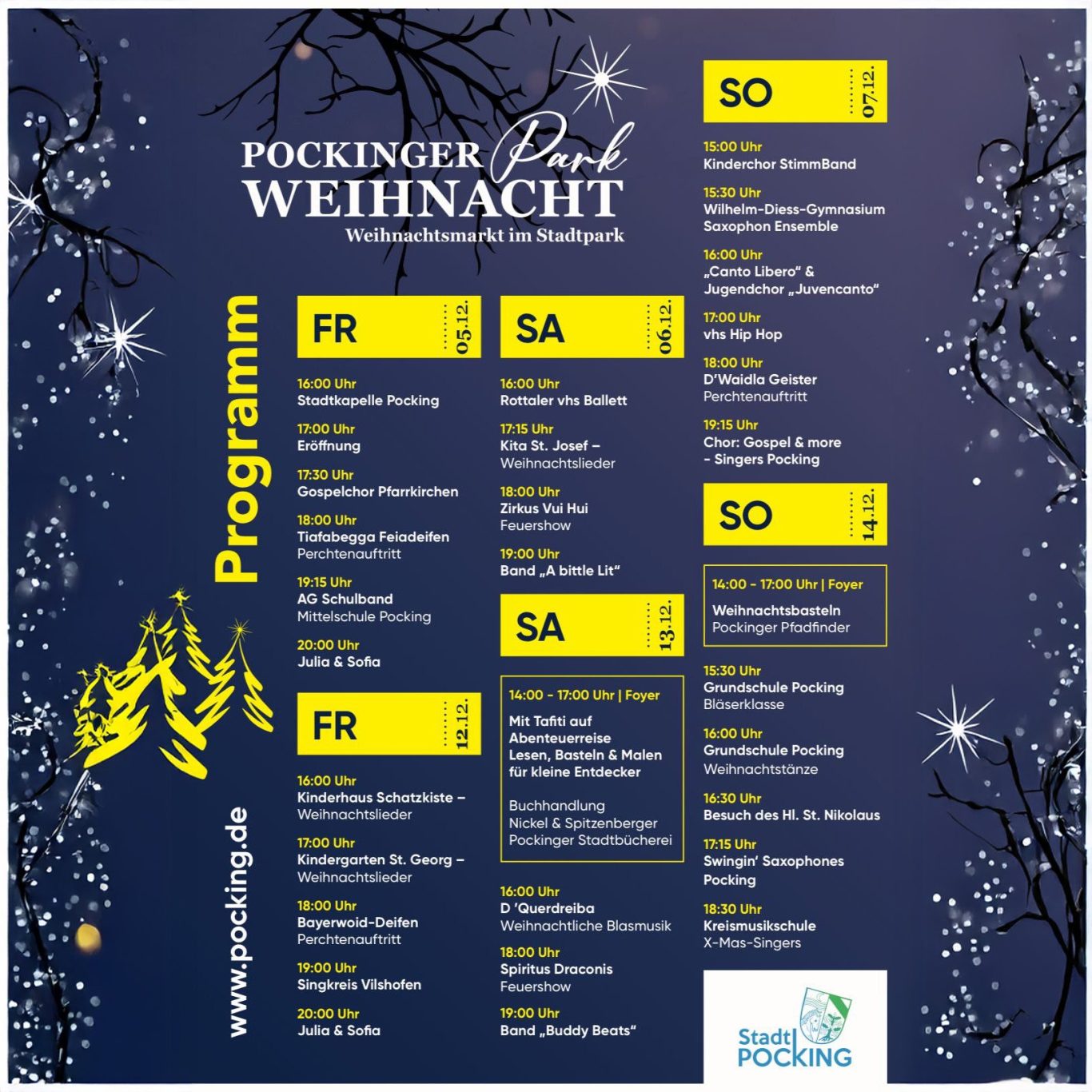 Willkommen zur Pockinger Park Weihnacht – dem stimmungsvollen Weihnachtsmarkt im Herzen von Pocking! Inmitten einer festlich geschmückten Park erwarten Sie gemütliche Atmosphäre, liebevoll dekorierte Stände und der verlockende Duft von Glühwein und frisch gebackenen Leckereien. Genießen Sie herzhaftes Essen, regionale Spezialitäten und handgemachte Geschenkideen, während festliche Lichter und weihnachtliche Musik für magische Momente sorgen. Die Pockinger Park Weihnacht lädt Groß und Klein ein, die Adventszeit in vollen Zügen zu genießen und sich auf die besinnlichen Tage einzustimmen.